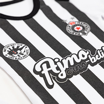 Klasični crno-beli dizajn sa grbom FK Partizan i natpisom "Ajmo crno-beli!" čini ga savršenim poklonom za najmlađe navijače.