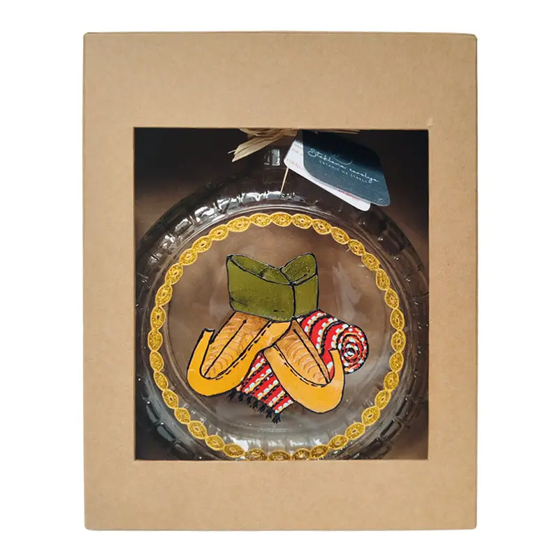 Staklena čutura sa slikom delova muške narodne nošnje.
