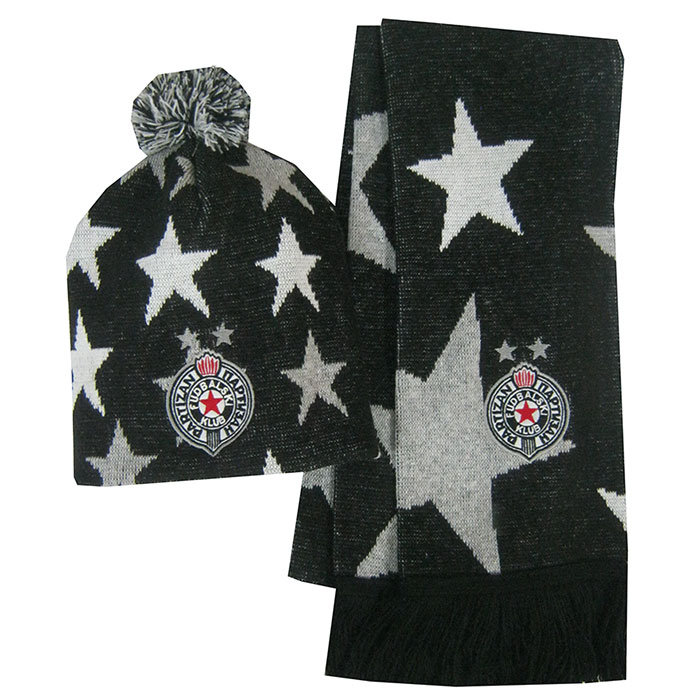 Kapa sa kićankom i šal. Oba sa motivom zvesdica i sa grbom FK Partizan.