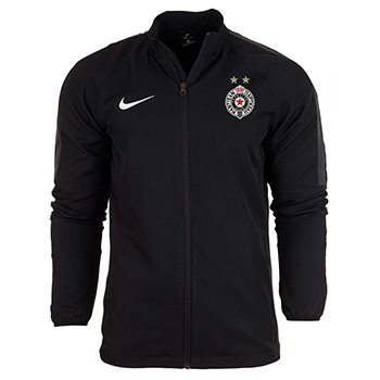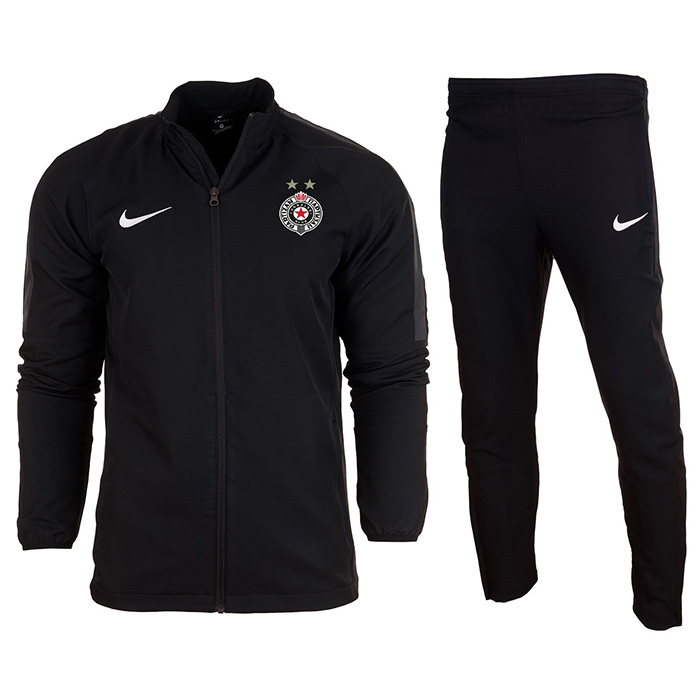 Црна дечија тренерка Нике, горњи и доњи део. Горњи део тренерке затвара се рајсфершлусом целом дужином. На грудима грб ФК Партизан и лого Нике. Доњи део тренерке са логоом Нике. Ужи модел.