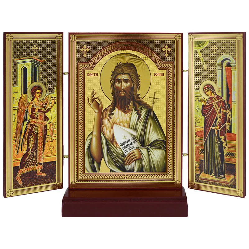 Triptih izrađen od medijapan ploče, koristeći tehniku kaširanja sa detaljima u zlatotisku, dizajniran je sa mogućnošću preklapanja.