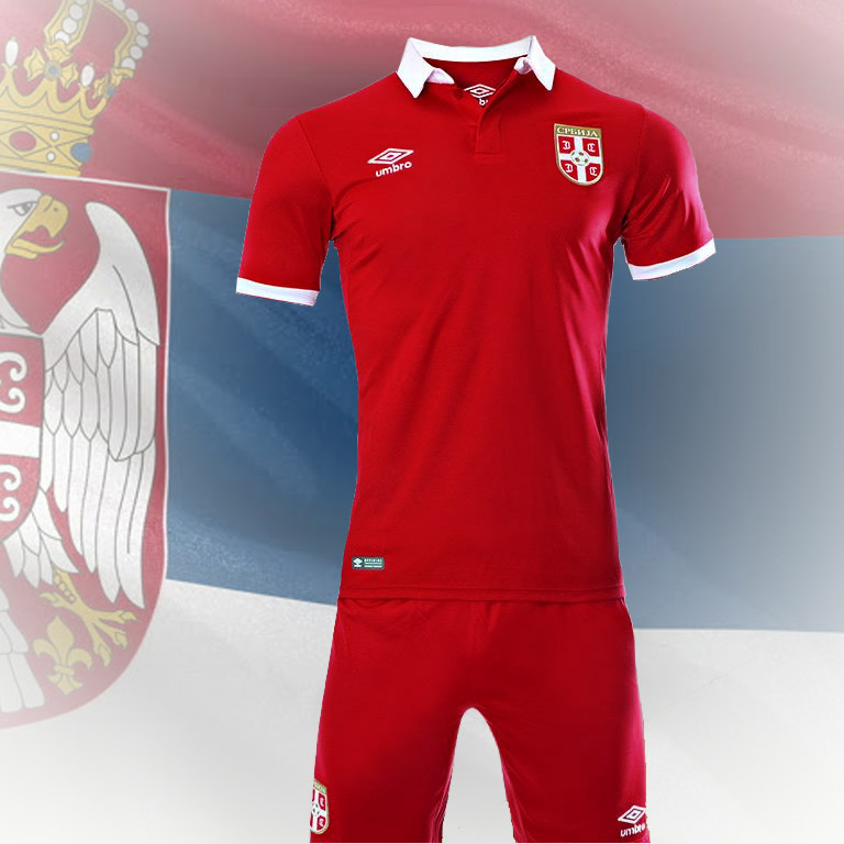 Home kit, red colour. On the left side of the jersey there is a National football assosiation emblem, while Umbro logo is on right.