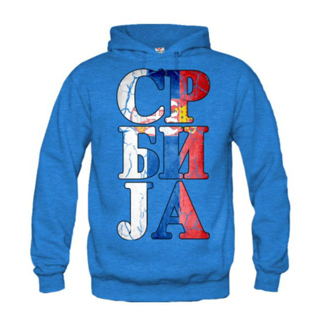 Duks sa kapuljačom, proizveden od 100% pamuka, sa aplikacijom Srbija u bojama zastave Srbije.