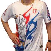 Beli duks sa kapuljacom, sa trobojnim odstampanim natpisom SRBIJA (na cirilici) i srpskim grbom na grudima, kao i odstampanom srpskom trobojnicom na desnom rukavu.