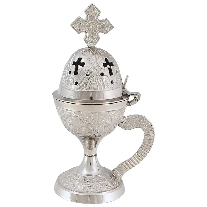 Ova kadionica, izrađena od pažljivo odabranog mesinga i prefinjeno niklovana, predstavlja spoj tradicionalnog dizajna i moderne obrade. Zahvaljujući svom elegantnom i trajnom sjaju, idealan je izbor za svakodnevnu upotrebu, bilo u bogoslužbenim prostorima ili tokom kućne molitve.