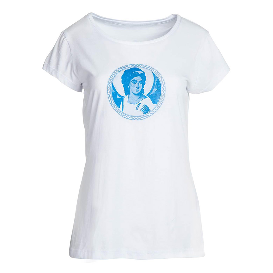 Bela ženska majica sa kratkim rukavima. Štampa Belog anđela na grudima (15 x 15 cm) i na leđima (3 x 3 cm).