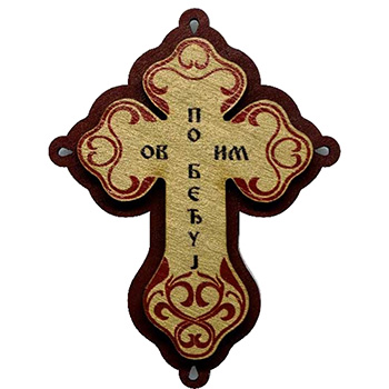 Krst je izrađen od najfinijeg lipovog drveta. Drvo se prethodno premazuje specijalnom zlatnom bojom koja dodaje na samom kontrastu i na izraženosti kontura. Seče se laserskom tehnikom. Krst se sastoji iz tri dela koji su spojeni u jedinstvenu celinu. Unutar krsta je odštampana, UV tehnikom, slika raspeća. Na poleđini krsta se nalazi slogan "Ovim pobeđuj".
