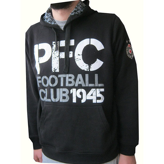 A classic men's hooded sweatshirt with a big "kangaroo" pocket. The hood is double-layered. Printed inscription on the chest PFC Football club 1945. FC Partizan emblem is embroidered on the left sleeve.
