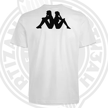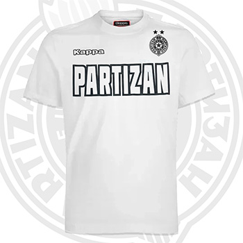 FK Partizan Kappa bela majica na kratke rukave sa natpisom Kappa, grbom FK Partizan i natpisom preko grudi "Partizan".