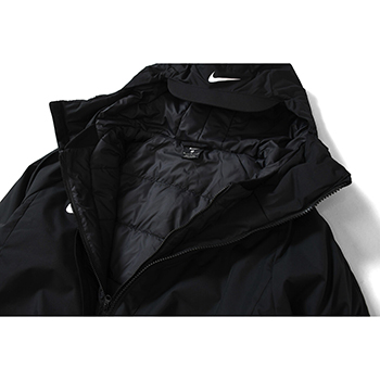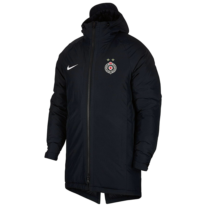 Crna jakna sa kapuljačom, sa logoom Nike i grbom FK Partizan na grudima. Zatvara se kvalitetnim zip zatvaračem celom dužinom. Sintetička postava sa zip zatvaračem. Čičak trake na rukavima. Džepovi sa zip zatvaračima.