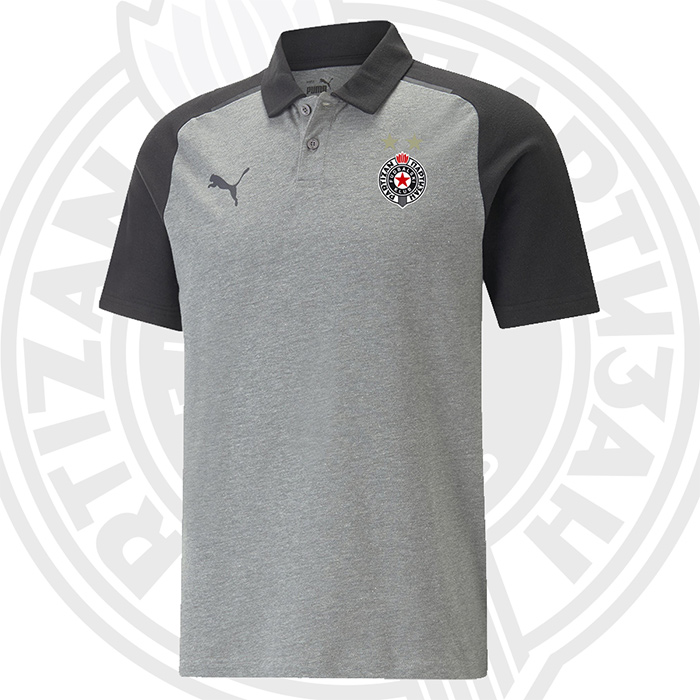 Siva polo majica sa crnim rukavima, urađena u saradnji sa tehničkim sponzorom FK Partizan, kompanijom Puma.