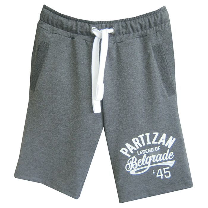 Идеалне за ове топле летње температуре - сиве памучне бермуде са белим учкуром. Натпис "Партизан легенд оф Белграде '45" на ногавици.