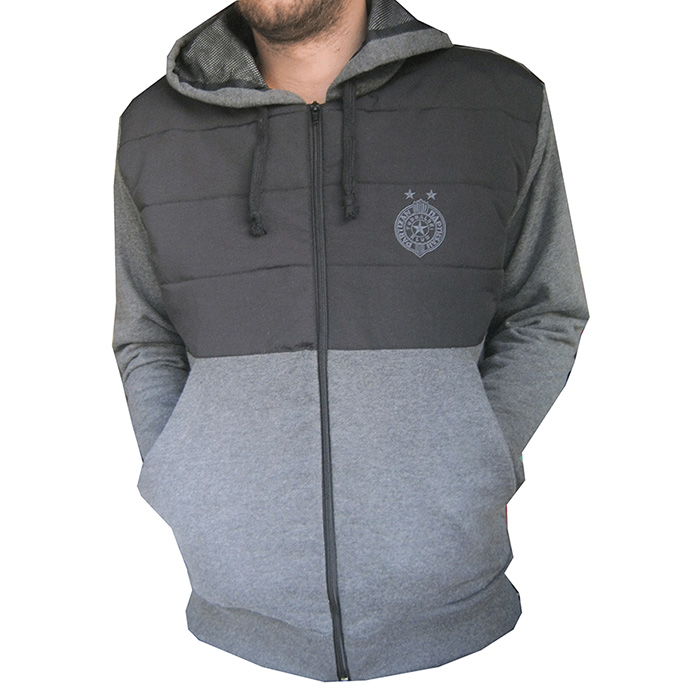 Sivi duks sa kapuljačom koja je sa unutrašnje strane postavljena mrežastim materijalom. Duks je na raskopčavanje sa kvalitetnim zipom cele dužine, praktičan je i pogodan za slojevito oblačenje. Gornji deo duksa je futrovan. Ima dva ušivena džepa sa strane. Grb FK Partizan na grudima.