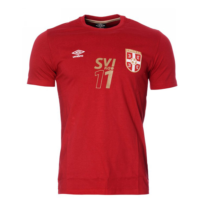 Crvena majica koja na grudima ima naštampan logo Umbro, grb FSS i manji, a na leđima veći, natpis SVI kao 1 u bojama naše trobojke. (Pored broja jedan ima još jedna outline jedinica pa se natpis može protumačiti i svi kao 11 - naših 11 reprezentativaca na terenu).
