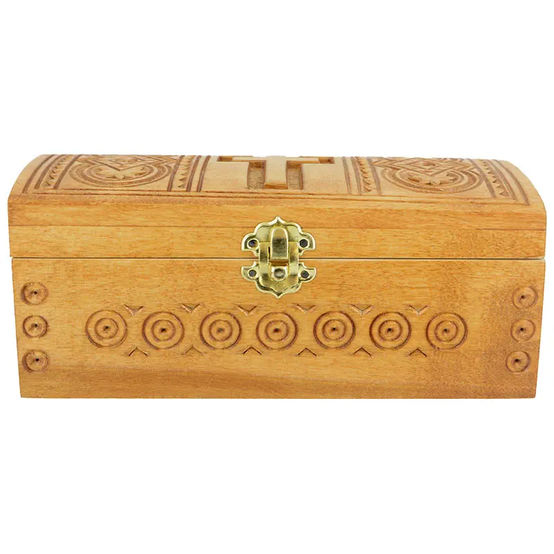 Ukrasna verska kutija je izrađena od drveta i ukrašena duborezanim motivima.
