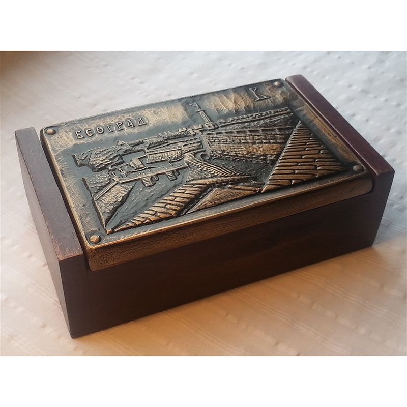 The casting of the lid is cast in a handmade mold. The process of making and processing the casting is adapted to the rustic souvenir look.