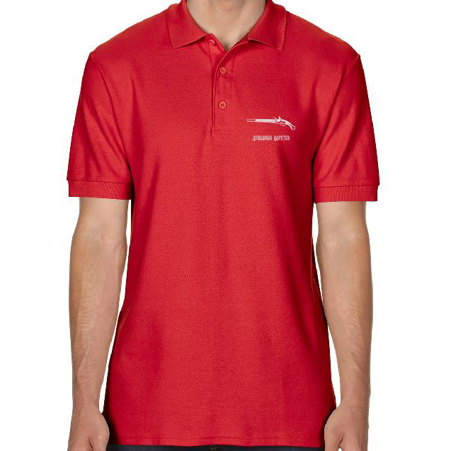 Crvena polo majica sa štampom na grudima - natpis Dušanovo carstvo i silueta pištolja (kubure) iz Prvog srpskog ustanka.
