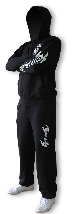 Модерна црна тренерка са капуљачом и одштампаним белим натписом СРБИЈА на подлактици и ногавици, као и српским грбом на грудима.
