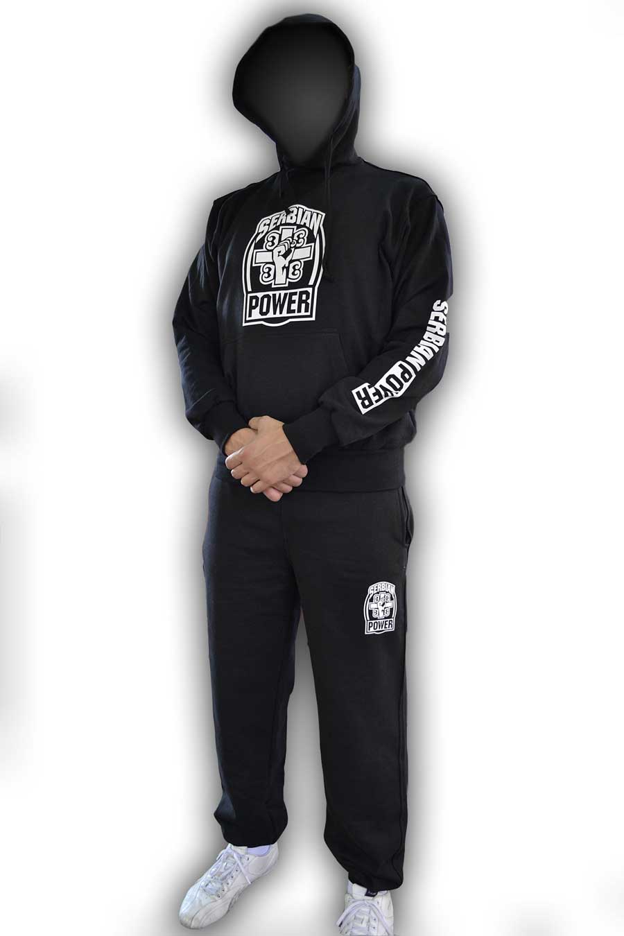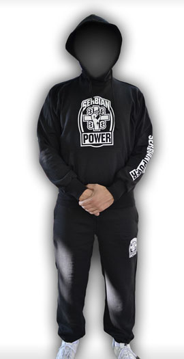Moderna trenerka sa kapuljačom i odštampanim natpisom SERBIAN POWER, srpskim ocilima i pesnicom kao simbolom srpskog otpora i proksa.