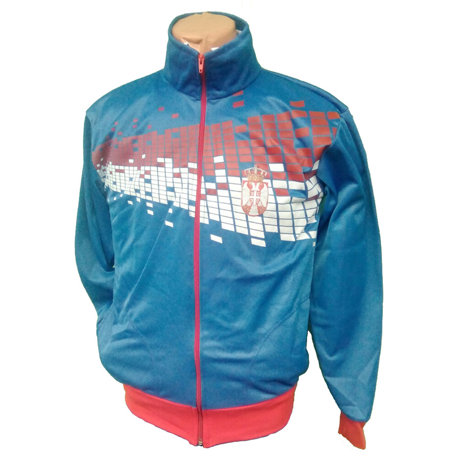 Плави горњи део тренерке са црвеним и белим штампаним дизајном преко целих груди и грбом Србије. На леђима натпис Србија.