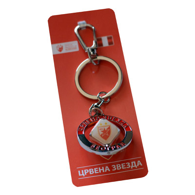 Metalni privezak za ključeve sa kockicom sa belim i crvenim stranama na kojima se nalazi grb FKCZ.