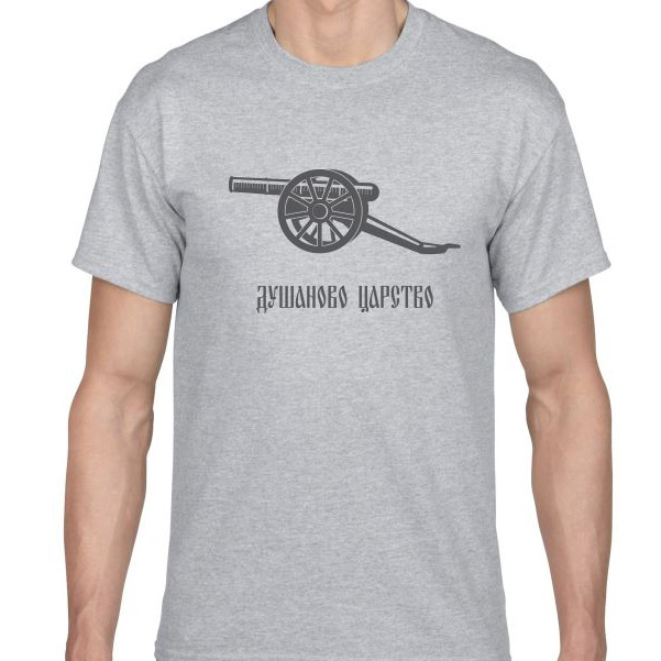 Siva majica sa štampom na grudima - natpis Dušanovo carstvo i silueta topa.