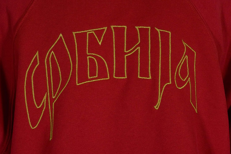 On the front it has embroidment in colours of Serbian flag, while on the back it has large cyrillic embroidery - SERBIA.